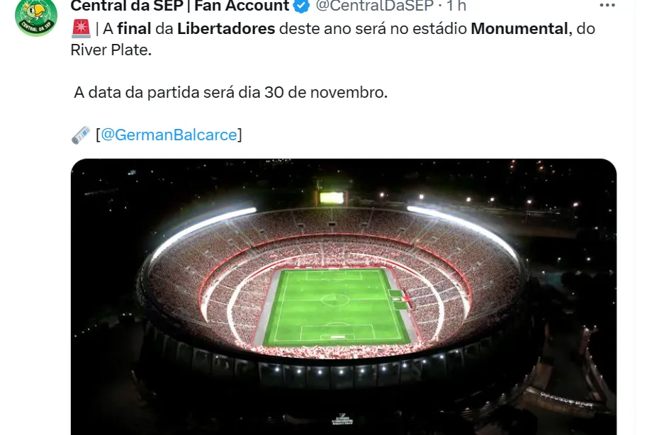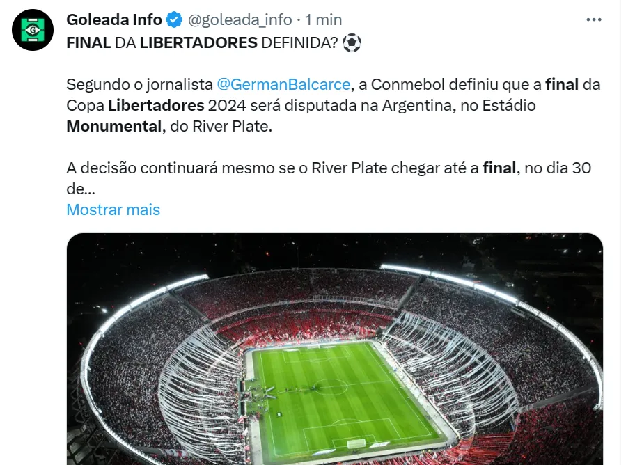 Mas a final, em jogo único, já tem local definido. O jornalista Argentina Germán Balcarce, do jornal La Nación, informou, nesta quinta-feira (11), que a Conmebol teria decidido fazer a decisão no Estádio Monumental de Nuñez, em Buenos Aires.