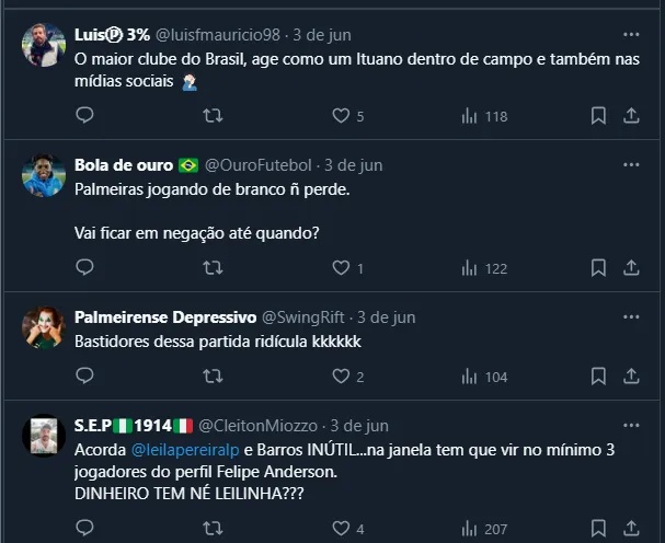 Dito isso, por mais que tenha a confiança do torcedor e esteja vivo em todas as competições que disputa, o torcedor do Verdão não está muito satisfeito com o desempenho do time, principalmente atuando como mandante.