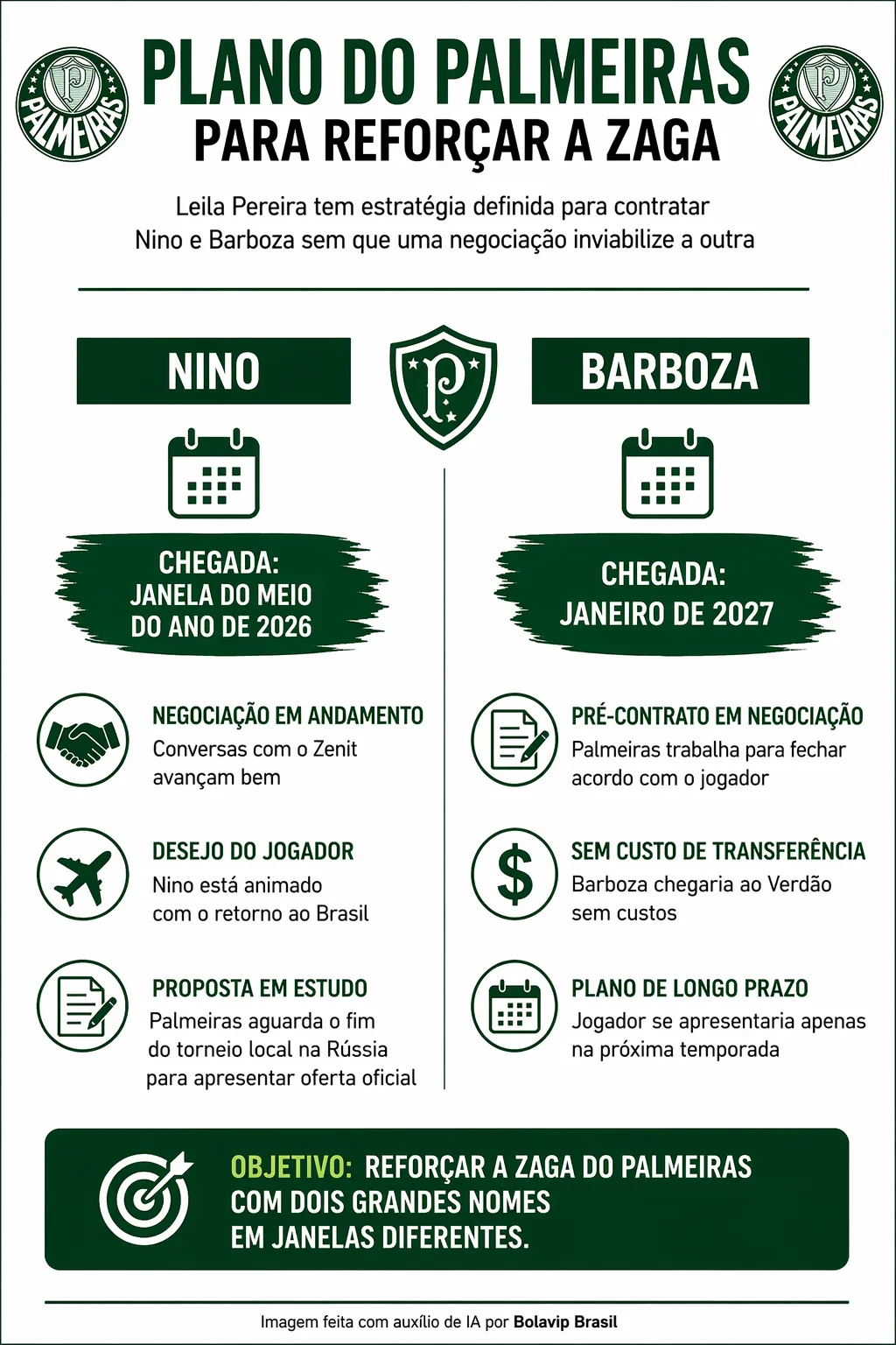 Entretanto, antes de abrir conversa com o defensor da equipe carioca, o Palestra já se mobilizava por Nino, do Zenit-RUS. A pergunta imediata vem logo à tona: Caso fecha com Barboza, Nino será descartado? A resposta é não! A gestão do Clube, comandada por Leila Pereira tem planos distintos para assinar com os dois defensores.