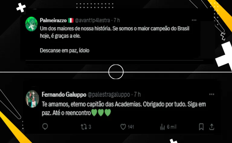 Porém, na noite da vitória, uma notícia muito triste mexeu com o futebol brasileiro, e principalmente com os torcedores do Verdão. Ídolo do Clube Paulista, o ex-jogador Dudu faleceu aos 84 anos em consequência de infecção abdominal, conforme informações do Alviverde.
