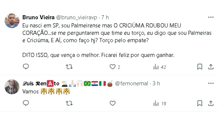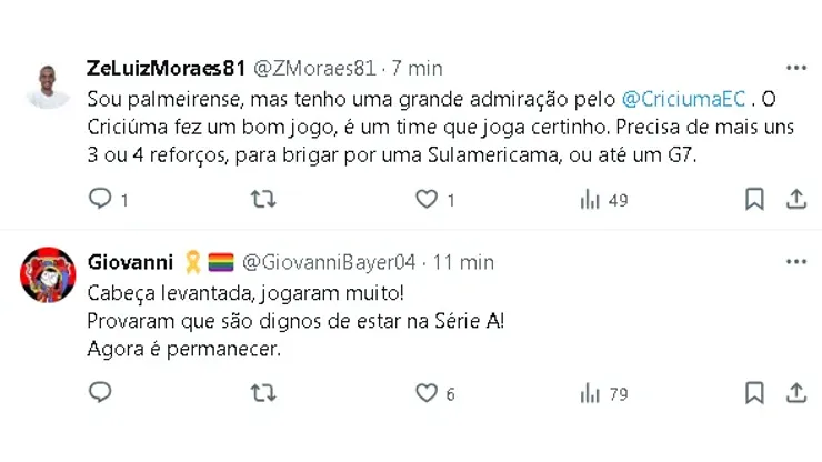 – Nossa equipe se manteve focada até o final. Infelizmente, nos acréscimos, eles fizeram o gol. Mas é ter tranquilidade. Sabemos do tamanho do Palmeiras, nossa equipe jogou de igual para igual. No deslize sofremos o gol. O Criciúma está crescendo. Vamos trabalhar bastante na semana para conquistar os três pontos na próxima partida.