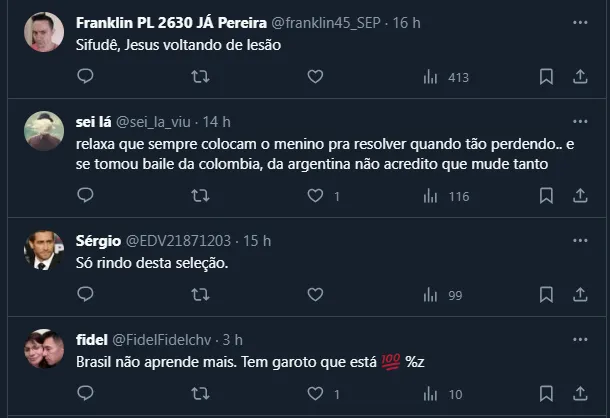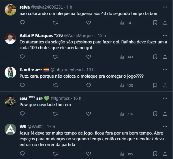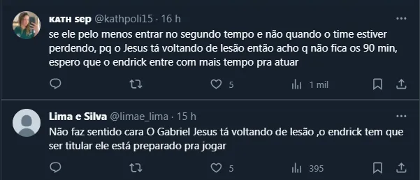 Contudo, de acordo com informações do GE, a tendência é que Endrick siga entre os suplentes e outra cria do Verdão apareça entre os titulares: Gabriel Jesus. Como está voltando de lesão, a torcida questionou a escolha de Diniz. Outro que corre por fora pela vaga é João Pedro.