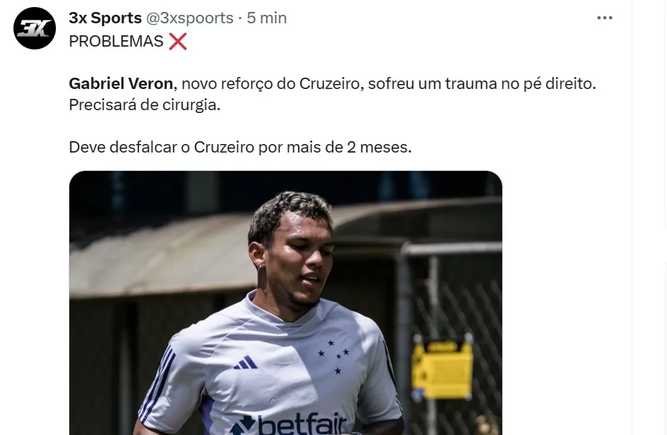 Segundo o setorista Guilherme Alves, que cobre o dia a dia na Toca da Raposa, Veron deve perder de nove a 12 semanas para a recuperação. No mínimo, dois meses sem o atacante, que obriga Ronaldo Fenômeno a ir ao mercado.