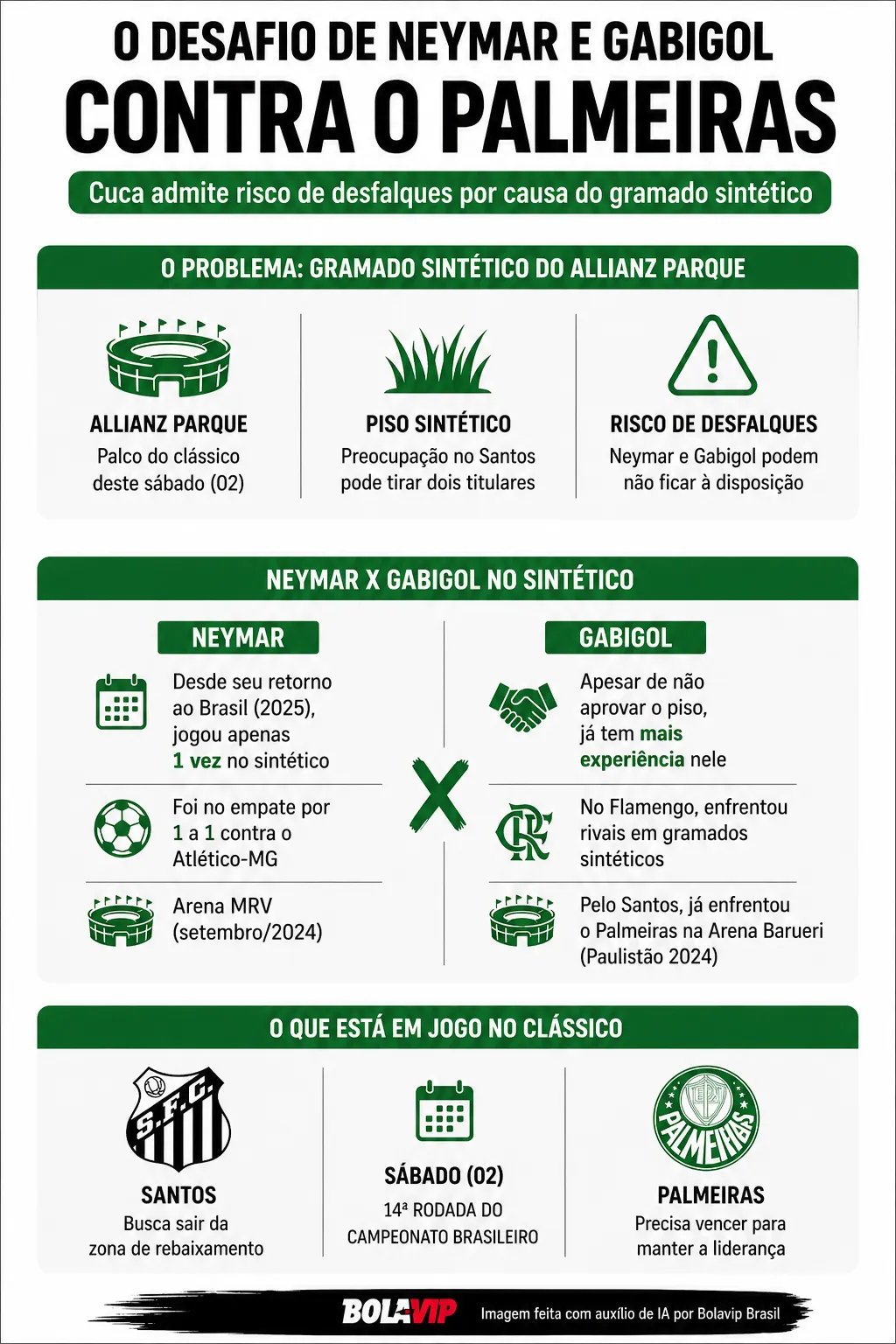 “Ainda não sei se vou contar com Neymar e Gabigol por conta das coisas que vocês (jornalistas) sabem o que eles pensam sobre o gramado sintético. Vamos conversar com os dois. Lógico que se puder tê-los diante do Palmeiras, a gente fica mais fortalecido”, revelou Cuca.
