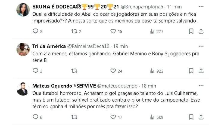 O Verdão vai para a partida com os seguintes jogadores: Weverton, Marcos Rocha, Gustavo Gómez, Murilo, Piquerez, Aníbal Moreno, Gabriel Menino, Luis Guilherme, Lázaro, Rony e Endrick. Técnico: Abel Ferreira
