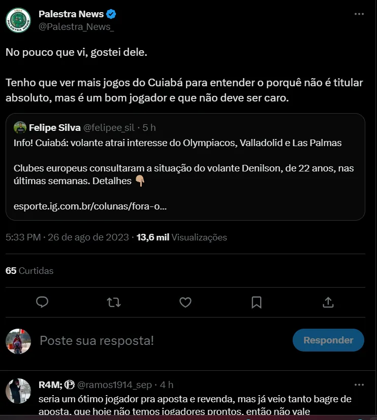 Torcedor palmeirense, Denilson seria um bom reforço para o Verdão?