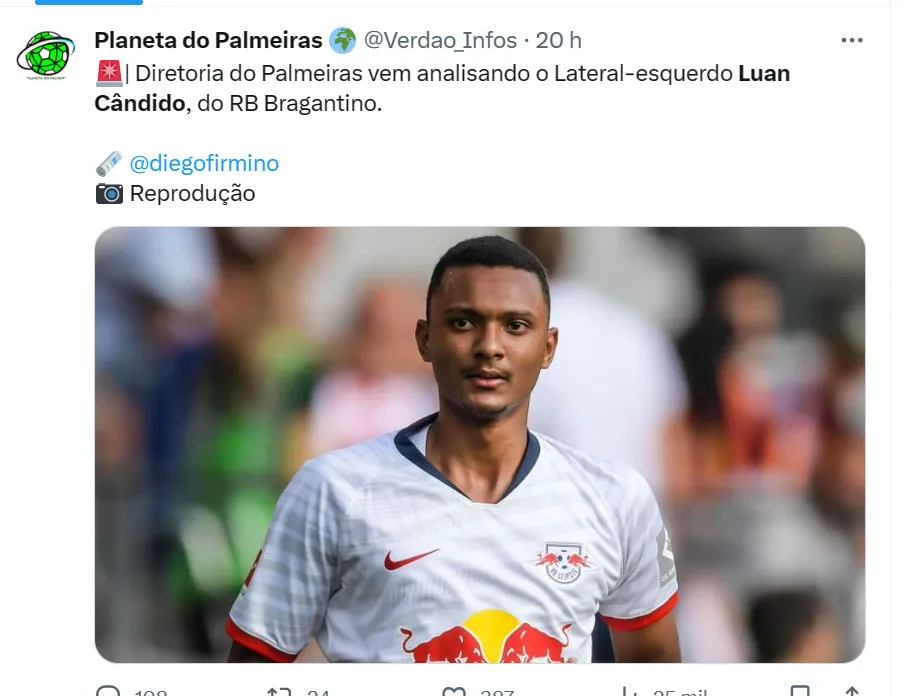 Nesta manhã, surgiu a informação de que Abel estaria de olho em Luan Cândido, lateral-esquerdo do Red Bull Bragantino e que é da base do próprio Alviverde. O jogador de 22 anos é titular no setor do time de Pedro Caixinha.