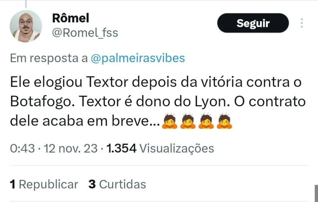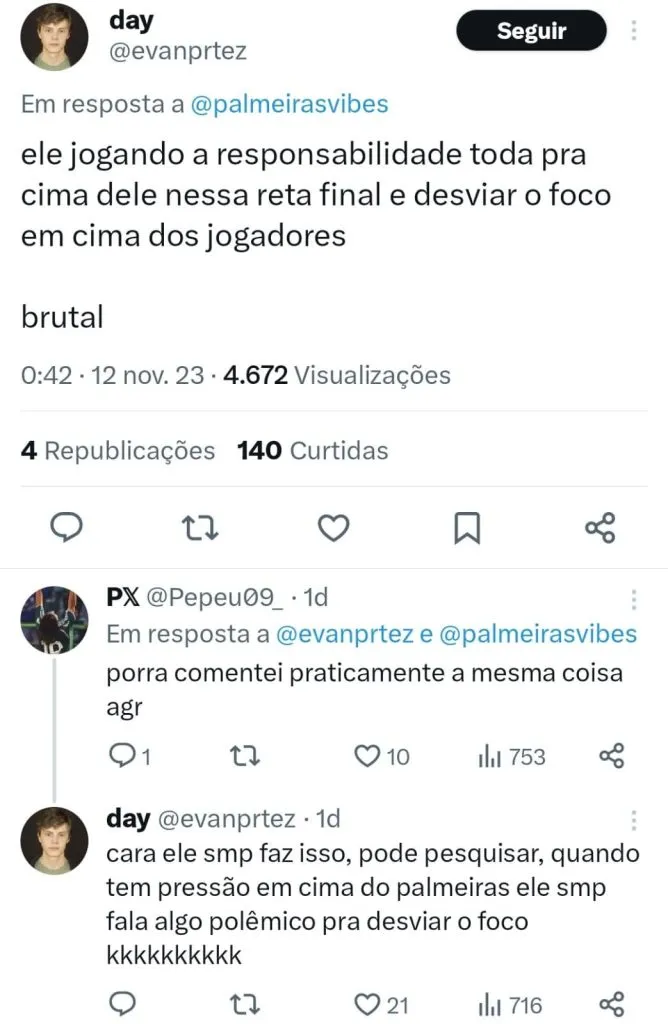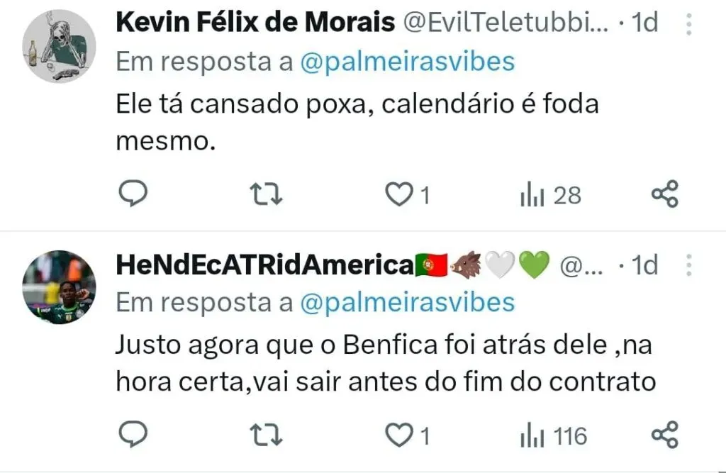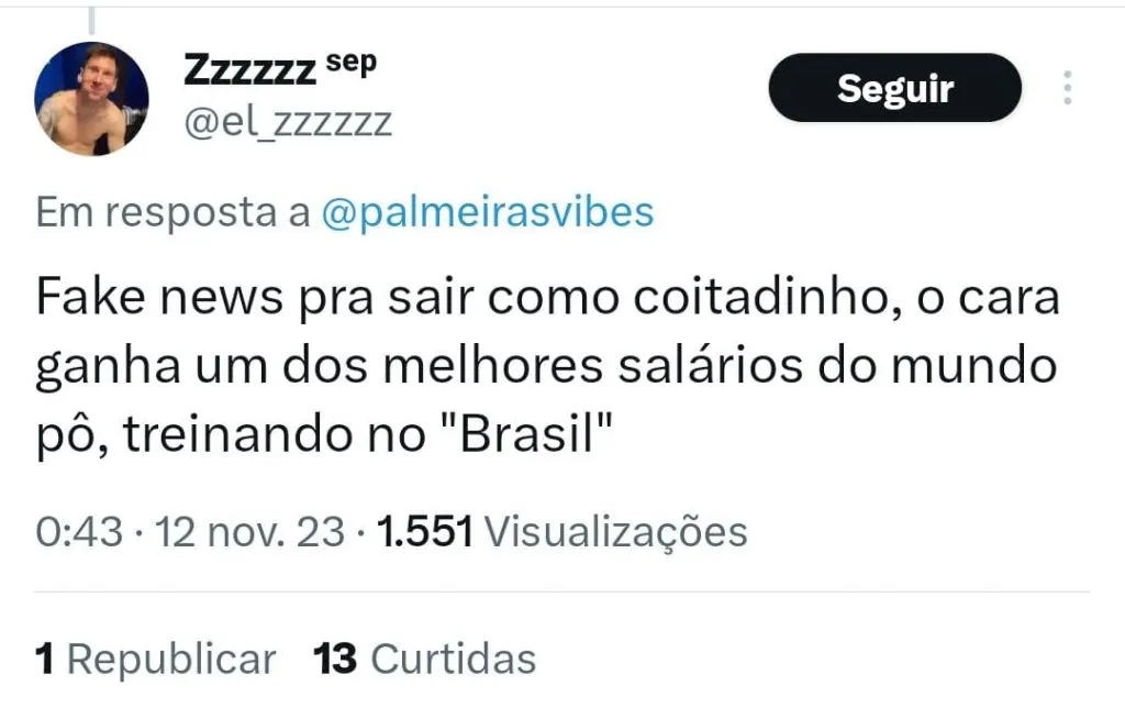 Ainda há quem acredite que Abel não sai antes do fim do seu vínculo que vai até dezembro de 2024. “Obviamente isso não vai acontecer. O que é certo é que ele não renova. E com certeza com essa diretoria eles não vão conseguir convencer nem pra ficar até o Super Mundial de 25”, avaliou outro internauta.