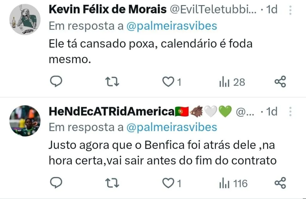 Há ainda quem acredite que o treinador está de olho em uma possível saída para o futebol europeu. “Vai pro Benfica como o Jorge Jesus fez… Acha que é dono do mundo, vai tomar um choque de realidade. Aproveita e leva o Veiga pra tão sonhada Europa dele”, disparou outro.