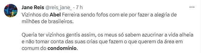 E além da torcida do Palmeiras, parece que os vizinhos do condomínio de Abel Ferreira também adoraram a vitória do Verdão. Tudo isso, depois de já ter tido que lidar com críticas de um “vizinho chato”.
