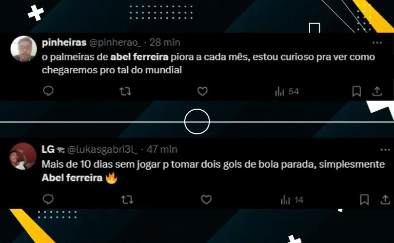 No X, antigo Twitter, muitos palmeirenses mostraram sua insatisfação com o péssimo desempenho defensivo do Alviverde e Abel Ferreira foi bastante criticado: “Defesa tá uma mãe! Abel Ferreira esqueceu de treinar a defesa”, postou um torcedor.
