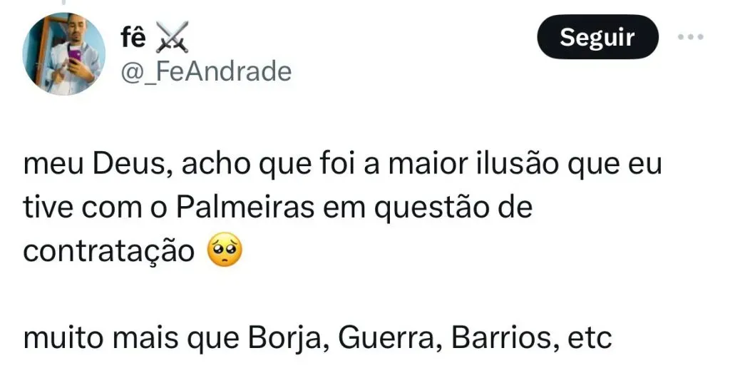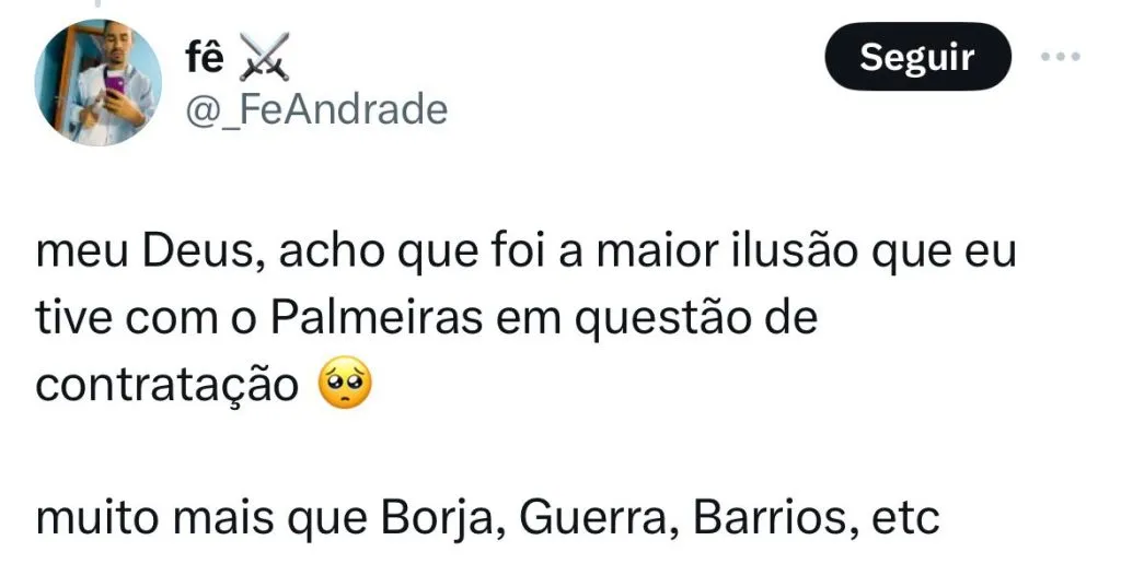 “Um time que elevou totalmente sua postura dentro e fora de campo, e houve esse interesse recíproco. Fizemos um esforço junto ao clube para fechar com o Palmeiras, e não tenho nenhum arrependimento nisso”, afirmou o atleta que continuou.