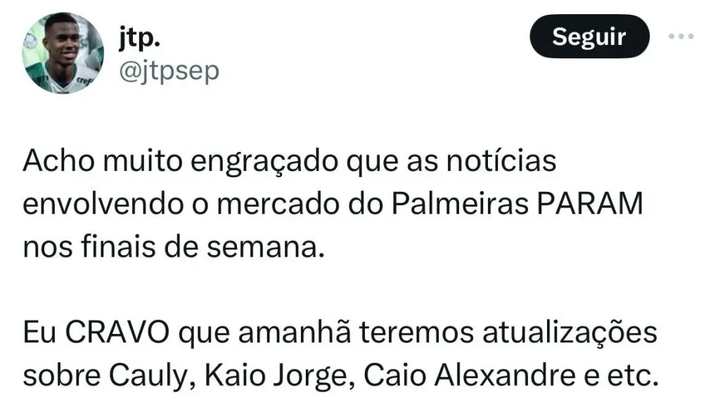 O comentarista elogiou a escolha do Verdão pelo jogador que, na opinião dele, encaixa com o estilo de jogo proposto por Abel Ferreira “O Palmeiras tem o privilégio de ter essa paciência de buscar no mercado jogadores pontuais. O Cauly é um jogador que pode facilmente se adaptar a esse estilo do Abel de jogar, e vai dar mais tranquilidade para o Zé Rafael, que poderá voltar a fazer a função dele