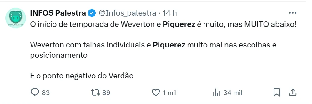 Apesar de ser ainda titular absoluto do time de Abel, Piquerez não começou bem 2024. Já são vários os erros defensivos juntamente do goleiro Weverton, outro que a torcida do SEP não perdoa.