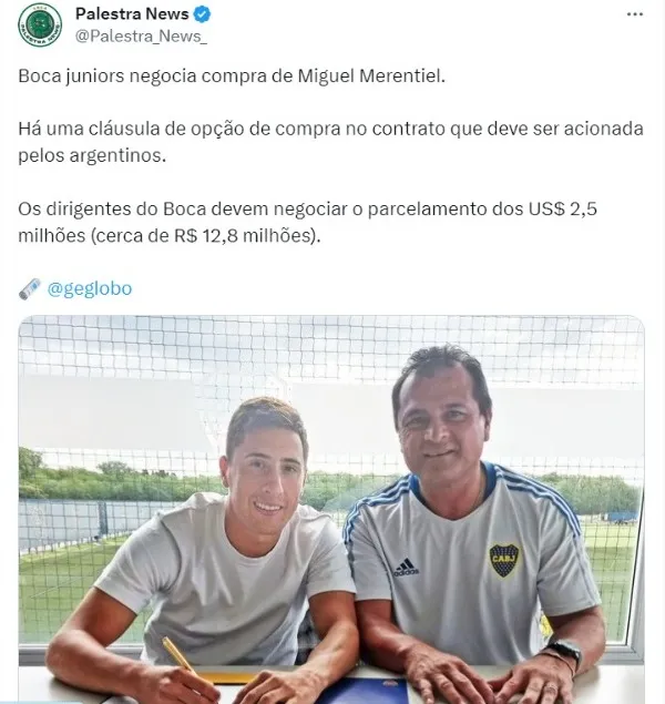 De acordo com informações do portal GE nesta sexta-feira (6), o Boca Juniors negocia com o Palmeiras a contratação de Merentiel. O atacante está emprestado pelo Verdão ao time argentino até o fim da temporada. Há uma cláusula de opção de compra no contrato que deve ser acionada pelo Boca.