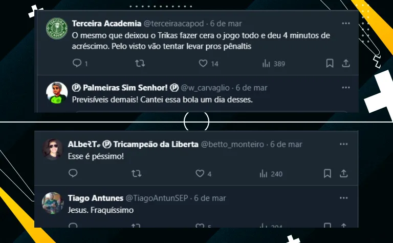 Por fim, é interessante deixar claro que, embora a torcida do Palmeiras não tenha aprovado o nome do árbitro, os são-paulinos também não gostaram da decisão. Veja a repercussão envolvendo os palestrinos:
