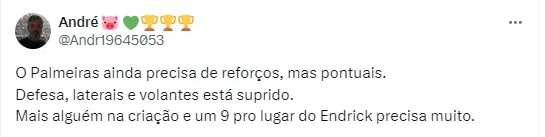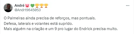 Segundo ele, foi tentado encontrar um nome no mercado, principalmente para substituir o jovem atacante de 17 anos. No entanto, a cúpula palmeirense não obteve sucesso: “Sondou o mercado, mas não conseguiu encontrar nehuma solução. Vai ficar com o Endrick até o meio do ano e tentar na janela de julho trazer alguém para substituí-lo”, disse.