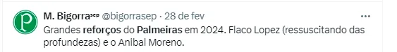 Também foi recordado quando o volante colombiano Richard Ríos chegou a ser oferecido para o seu maior rival, o Corinthians, em 2022. No entanto, o Alvinegro Paulista acabou desdenhando e não quis o atleta, que vem se destacando nas Alamedas.
