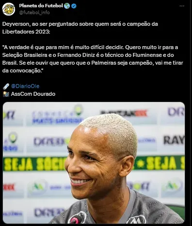 Pensando nessa disputa pelo título da Copa Libertadores, o atacante Deyverson, que jogou pelo Palmeiras recentemente e marcou o gol do tricampeonato da Libertadores do Verdão, revelou sua torcida pelo título do torneio. Porém, para a surpresa de muitos, ele esqueceu o Palestra e expôs que por causa de Diniz e seu sonho na Seleção Brasileira, ele pode torcer para o Fluminense.