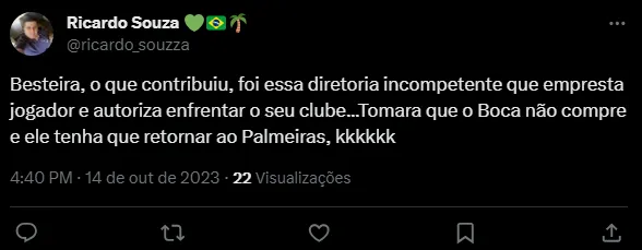 O Palmeiras acabou eliminado da Libertadores nos pênaltis para o Boca Juniors depois de empatar por 1 a 1 e ser derrotado nos pênaltis por 4 a 2, dando adeus ao sonho do tetra da competição. Curiosamente, quem fez o gol da jogada da equipe argentina foi o atacante Merentiel, que ainda pertence ao Verdão e está emprestado ao Boca Juniors.
