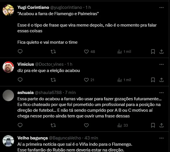 No entanto, a nova diretoria corintiana vem realizando alguns movimentos nos bastidores e um deles foi o de provocar Palmeiras e Flamengo na noite desta quinta-feira (20), em uma entrevista de Rubens Gomes, o Rubão.