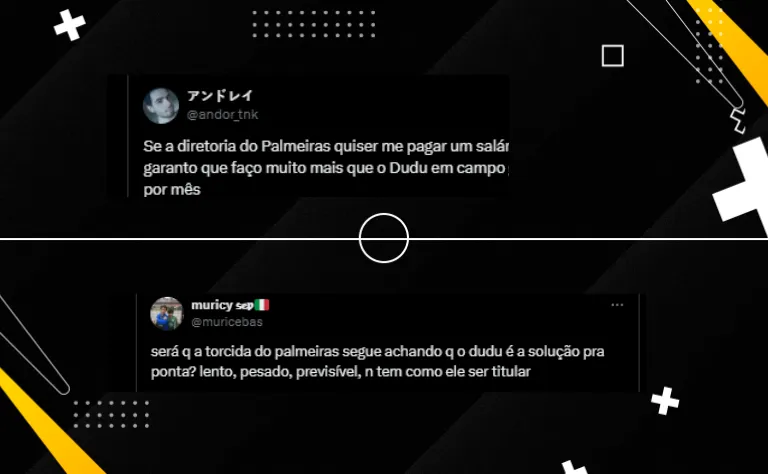 “Será que a torcida do Palmeiras segue achando que o Dudu é a solução pra ponta? Lento, pesado, previsível, não tem como ele ser titular”, detonou outro torcedor do Verdão sobre a partida do camisa 7 do Alviverde Paulista.