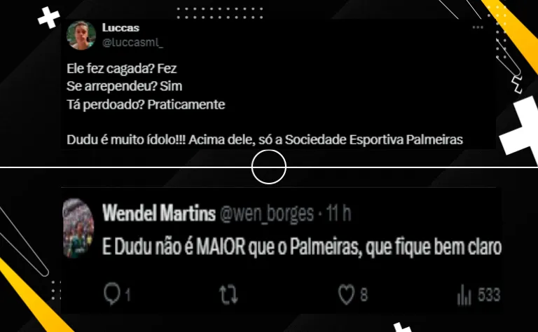 Dudu foi além no pronunciamento de pouco mais de quatro minutos: “Fico feliz e honrado de vestir a camisa do Palmeiras, estar representando esse clube que eu tenho um carinho e respeito desde 2015, quando coloquei pela primeira vez essa camisa me tornei palmeirense, um cara que defende esse clube, que respeita esse Clube”, completou.