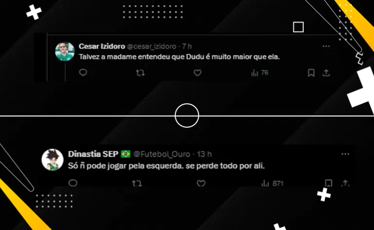 “Observação… Dizem que o Dudu está treinando bem. Voando. E daqui para frente, vai começar aparecer mais nas postagens do clube, TV Palmeiras e tudo mais… Até então, existia uma ordem de cima para evitar a exposição”, informou Diego Firmino.