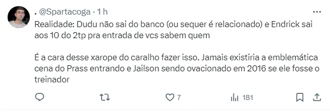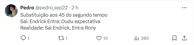 “Substituição aos 45 do segundo tempo. Sai: Endrick. Entra: Dudu, expectativa. Realidade: sai Endrick, entra Rony”, brincou um dos torcedores na internet.