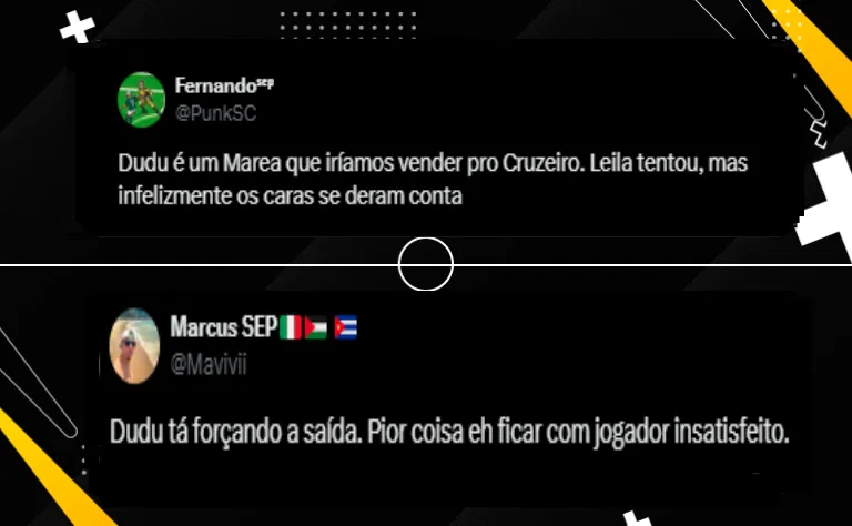 Enquanto Abel falou sobre o atacante, outros usuários da rede social também reclamaram da postura de Dudu: “Não quer p** nenhuma, trotando em campo, tocando de lado e pra trás. Eu não colocava mais pra jogar”, se revoltou um torcedor.