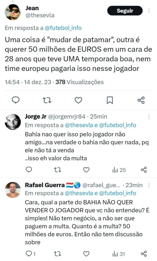 Apesar disso, o Bahia teria estabelecido uma condição para negociar o jogador. O meia de 28 anos só deixa o Esquadrão por 50 milhões de euros, aproximadamente R$ 269 milhões. Com o respaldo do Grupo City, o clube só libera o jogador com o pagamento da multa rescisória.