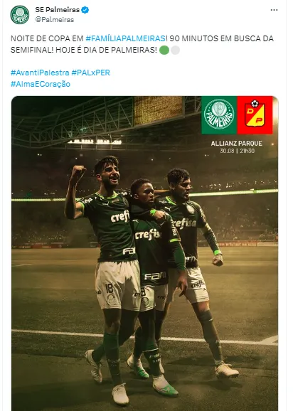 O Palmeiras vem de vitória no Campeonato Brasileiro. Em um jogo polêmico, o Alviverde Paulista venceu o Vasco, por 1 a 0, com um golaço de falta de Raphael Veiga. Agora, a equipe comandada por Abel Ferreira se concentra na partida de volta contra o Deportivo Pereira, da Colômbia, pelas quartas de final da Copa Libertadores da América.