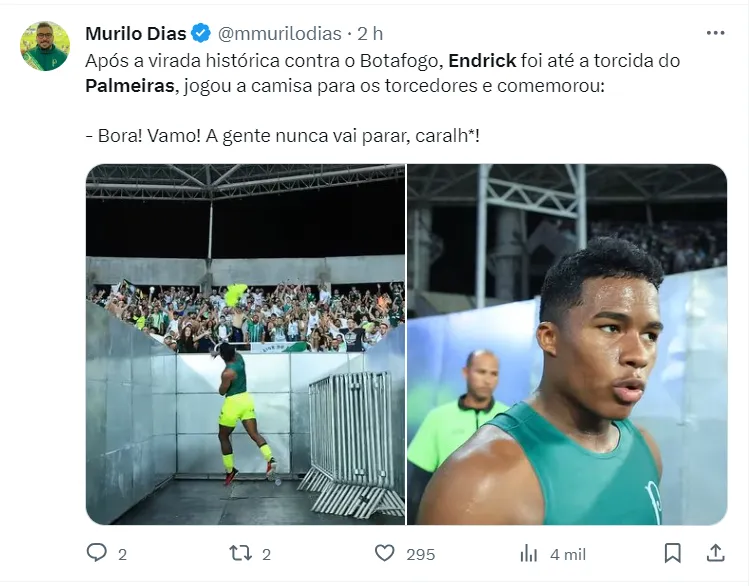 Endrick marcou dois, dos quatro gols, na vitória contra o Botafogo e empolgou a torcida nas redes sociais. Vale destacar que o jogador não vinha ganhando muita chance com o técnico Abel Ferreira, o que acabou se tornando crítica por parte da imprensa espanhola.