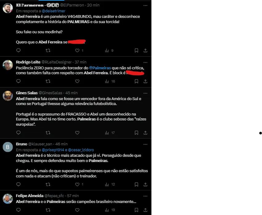 “Nosso grupo de trabalho acredita sem ver e acredita sempre. Não estou dando recado a ninguém, mas essa equipe luta sempre até o fim e dá o seu melhor. A comissão faz a mesma coisa. Nesses três anos, o Palmeiras joga todas as competições competindo.”, e Abel continua…