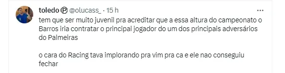 Porém, os esforços parecem ter sido em vão. Isso porque de acordo com o jornalista Julio Miguel Neto, o atacante decidiu prorrogar seu vínculo com o Flamengo, tendo um contrato de dois anos e também um aumento salarial. Segundo ele, o staff do atleta já avisou a direção palmeirense que a situação chegou ao seu desfecho. Dessa forma, a equipe terá que focar em outro nome para o setor ofensivo.