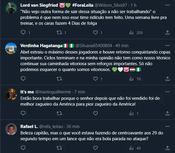“A eliminação foi muito forte, fim de temporada pega forte, também. Não tem outra forma de sair da situação, se não for trabalhando. Já mostramos muitas vezes que saímos de situações adversas. Nosso time não está acostumado a ficar vários jogos sem ganhar, mas não tem outra forma de sair de uma situação como essa, se não for trabalhando”, disse à reportagem do Premiere. O próximo compromisso será domingo (22), às 18h30, contra o Coritiba.