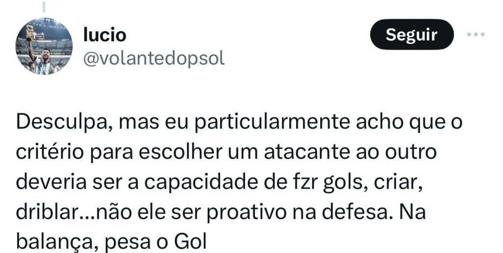 O que vem entregando? Muita coisa! Vocês só olham para o erro e o erro é muito fácil de ver. Mas a dedicação, o correr para trás, o esforço pela equipe, isso ninguém olha. A maior parte de vocês só olha para o jogador com a bola no pé e ai é fácil detectar o erro. Naquele lance, ninguém mais que o Breno queria fazer o gol. Ninguém! Isso acontece com todos… Mas a dedicação é sempre”, concluiu.
