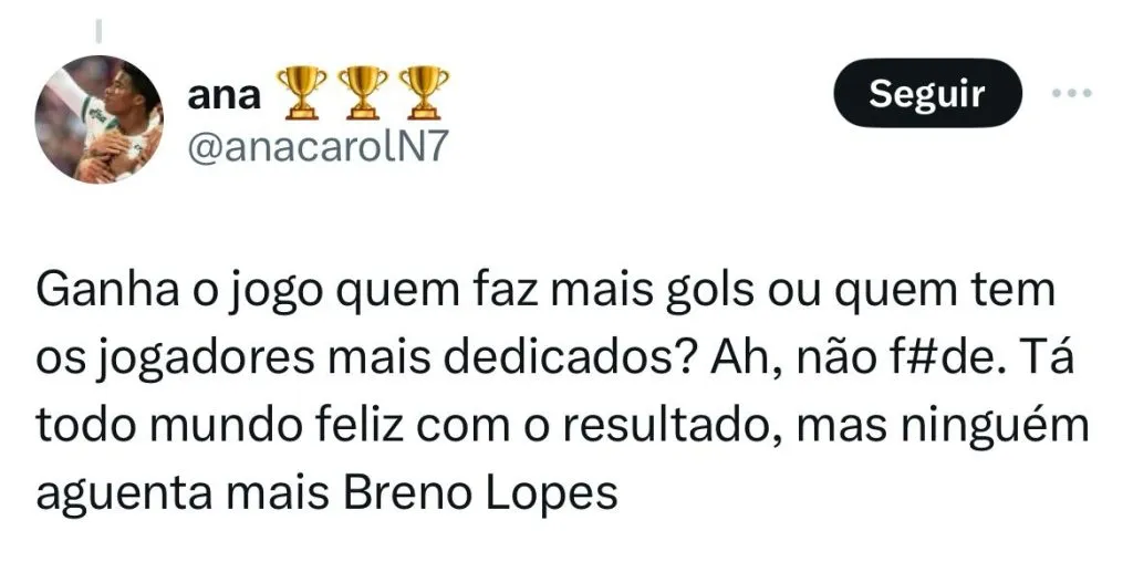 No entanto, nem tudo é motivo de comemoração no Palestra. Isso porque a torcida do Palmeiras se revoltou com o gol perdido por Breno Lopes. Nas redes sociais, muitos membros da torcida que canta e vibra pediram para que o duelo contra o América Mineiro tenha sido o último jogo do atleta pelo maior campeão nacional.