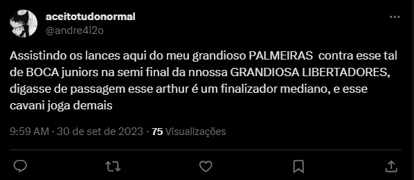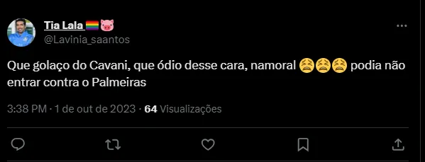 “Que golaço do Cavani namoral podia não entrar contra o Palmeiras”, “Estou assistindo o El Clasico e posso dizer que esse time do Boca é horrível de ruim. O Palmeiras não ter feito gol quinta-feira foi uma lástima”, “Assistindo os lances aqui do meu grandioso PALMEIRAS contra esse tal de BOCA juniors na semi final da nnossa GRANDIOSA LIBERTADORES, digasse de passagem esse arthur é um finalizador mediano, e esse Cavani joga demais”, foram alguns dos comentários.
