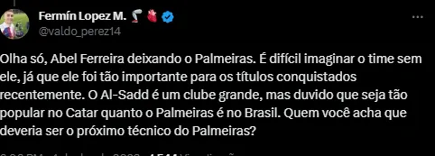 O treinador, cujo contrato com o Palmeiras vai até o fim de 2024, enfrenta agora a incerteza sobre seu futuro no clube. Apesar das informações sobre a possível despedida, Abel Ferreira mantém mistério e afirma que a decisão será tomada somente ao término do Campeonato Brasileiro.