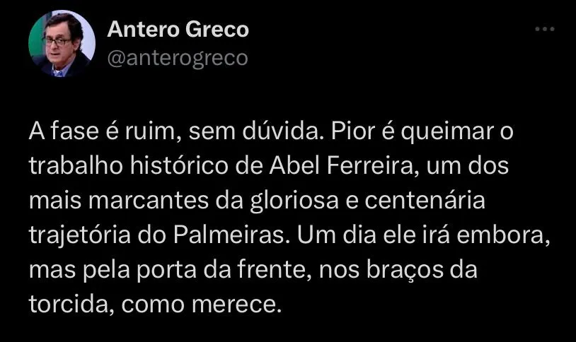Durante o programa “Os Donos da Bola”, Neto reforçou sobre o que ele acha sobre a permanência de Abel Ferreira no Palmeiras para 2024. “Eu acho que não fica”, disse o apresentador. O contrato do treinador se encerra só em dezembro de 2025, mas por estar vivendo o seu pior momento no clube desde que foi contratado, Abel pode estar deixando o Verdão antes de 2025.