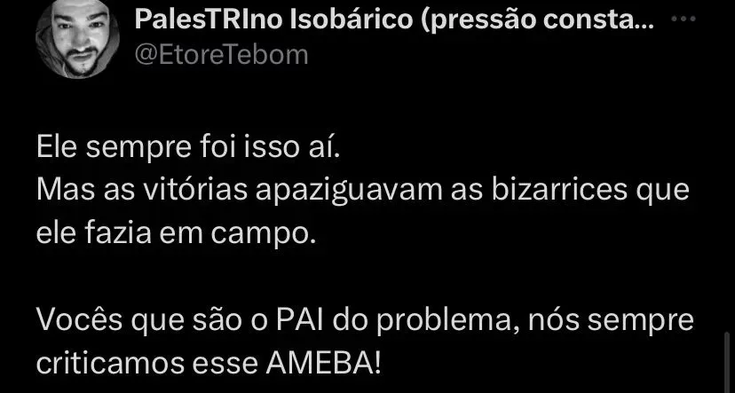 “Agora, ele não está em boa fase como muita gente não está em uma boa fase. Eu acho muito pegar no pé dele, do Veiga, do Weverton, que é outro cara extremamente focado. O Veiga eu conheço pouco, mas joga bola. Ele foi fundamental. Eu acho que a torcida tá muito doida. Calma.”, completou.