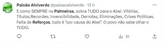 “Ele faz (milagre), ele faz. O Abel tem jogadores bons, mas poderia, pelo clube e pelo que o Palmeiras representa hoje, poderia ter mais jogadores, mais peças. De repente, quando um jogador não está bem, um jogador machucado, um jogador está fora por tudo tomar cartão”, iniciou o ex-jogador, que não parou por aí: