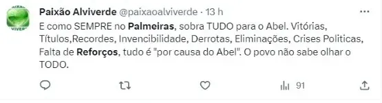 “Acho que o Palmeiras tem esse valor financeiro para ter um melhor elenco hoje. Então o Palmeiras se transformou num clube onde todos querem jogar. Então não é por falta de querer que os jogadores não vêm. Então acho que o Abel tem que ter pressa assim. O que tem ele hoje mãos poderia ficar melhor. O que o Palmeiras não conquistou hoje, com um elenco melhor ele conquistaria“, salientou Assunção.