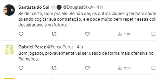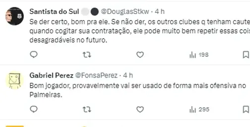É uma expectativa grande e uma sensação muito boa estar em um clube do tamanho do Palmeiras, que vem conquistando tantos títulos, feito grandes campeonatos no Brasil e na América do Sul. Espero também poder comemorar títulos. Vamos juntos nesta jornada – finalizou.