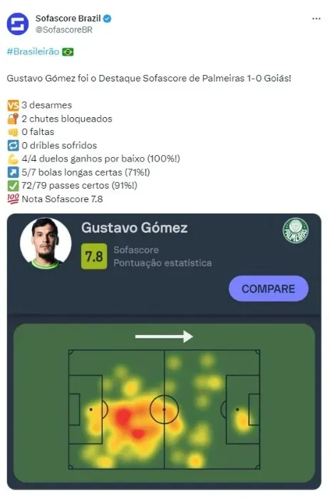 O ídolo Alviverde, por sua vez, teve uma nota de 7,8, pelo Sofascore. Gómez é fundamental para a equipe de Abel Ferreira, chegou a ser sondado pelo futebol árabe, mas o Palmeiras recusou prontamente, entendendo que o zagueiro é um dos pilares desse elenco vencedor do técnico português.