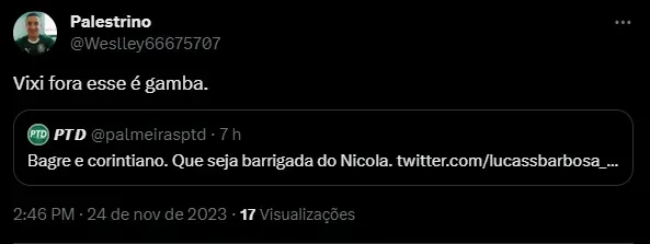 Nas redes sociais, os palmeirenses não gostaram da atitude de Carlos Vinicius e já ‘reprovaram’ a vinda dele ao Palmeiras. Nesta temporada, o jogador soma oito jogos e dois gols marcados.
