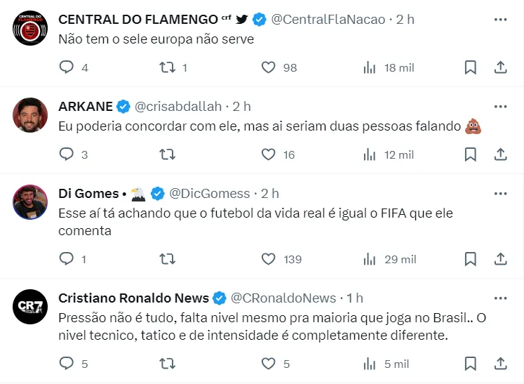 Caio questionou se algumas escolhas de Diniz não são pautadas apenas em jogadores que atuam no futebol mundial. O comentarista destacou a qualidade de futebol nacional, apontando a competividade e pressão que grandes equipes sofrem no Brasil. Com isso, defendeu a convocação de nomes como Mayke e Ayrton Lucas para as laterais.