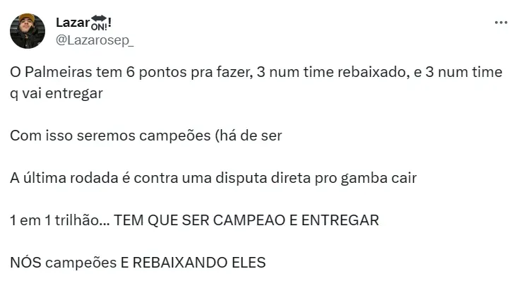 Apesar da vantagem e com a autonomia de depender de si próprio pra levantar o troféu, o Palmeiras não conta com a confiança de Cicinho, ex-jogador e agora comentarista esportivo do SBT.