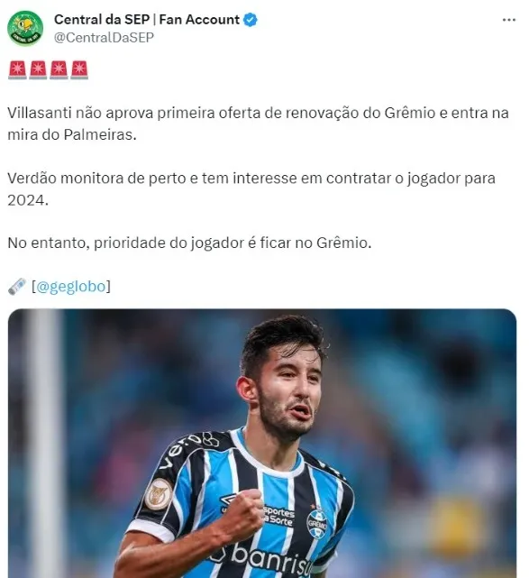 De acordo com informações do GE, Matias Villasanti está sendo observado de perto pelo Palmeiras após negar a primeira oferta de renovação enviada pelo Grêmio. Negociações de renovação com o Tricolor ainda estão em andamento mesmo com o interesse Alviverde.
